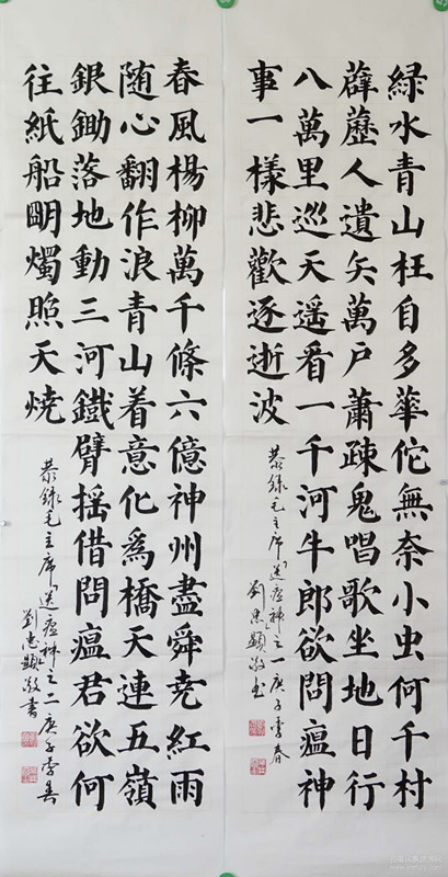 劉忠顯先生楷書(shū)結(jié)合《九成宮碑》及當(dāng)代田英章老師筆法、結(jié)構(gòu),又適當(dāng)融入柳、趙及碑、隸特點(diǎn),崇尚嚴(yán)謹(jǐn)、規(guī)范、流暢的書(shū)風(fēng);行草在文革期間曾臨摹毛體,頗受其影響;小楷臨摹文征明《琴賦》,頗有心得。