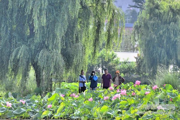 因?yàn)橐惶梁苫ǎS多人把休閑時(shí)光花在了荷塘,讓這里有了一場(chǎng)夏天里最美的聚會(huì)。認(rèn)識(shí)的不認(rèn)識(shí)的人因荷而“藕遇”,彼此打一聲招呼,互相給一個(gè)微笑后,又各自以自己的方式,看荷、拍荷、想荷,雖目標(biāo)相同卻又自得其樂(lè),互不影響。