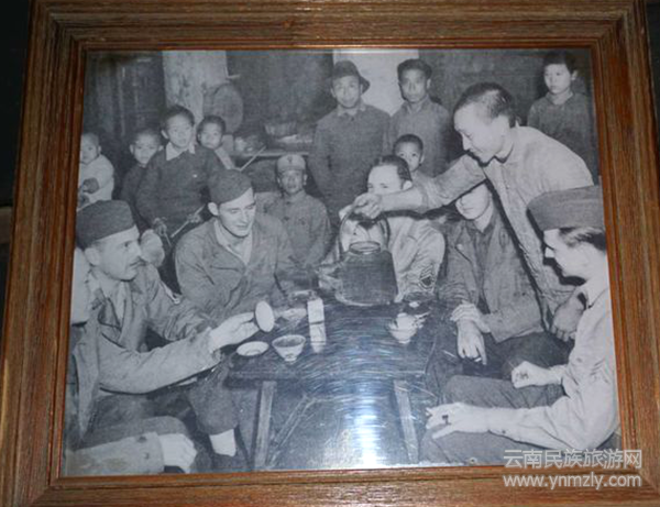 墻上掛著南僑機工、盟軍士兵在這里喝茶的照片。