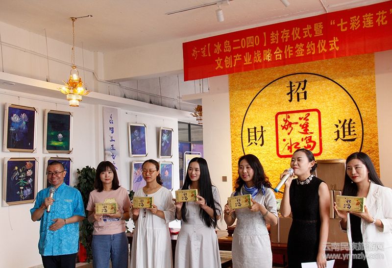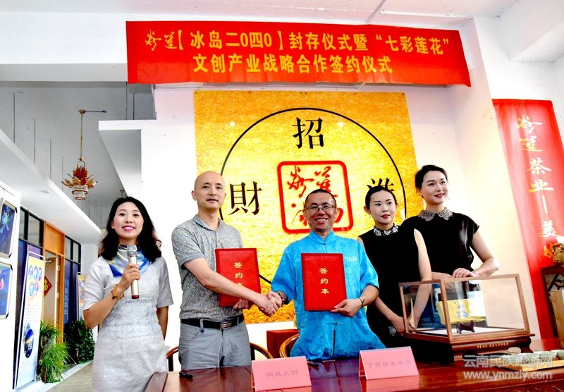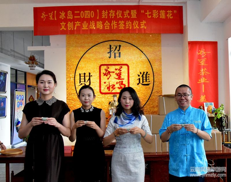 云南民族旅游網(wǎng)訊(文圖尹紹平 李關(guān)富)以丁昌勝先生七彩蓮花畫作為元素,結(jié)合冰島古樹普洱茶相互疊加的焱蓮【冰島二0四0茶磚】收藏封存儀式于一個(gè)吉祥的日子一2020年8月8日在紫云青鳥丁昌勝美術(shù)館圓滿舉辦。丁昌勝美術(shù)館與四川成都的桐鳳文創(chuàng)“七彩蓮花”文創(chuàng)產(chǎn)業(yè)戰(zhàn)略合作簽約儀式也同時(shí)成功舉行。