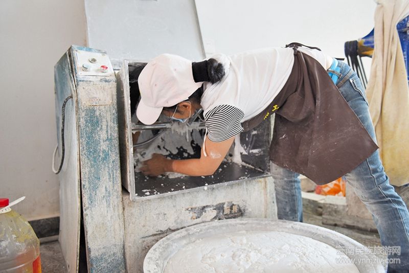 那,米線是如何由米變成線的呢?估計沒多少人關(guān)注過。之前有一次跟著朋友去勐統(tǒng),到了一家做米線的作坊,第一次認(rèn)真地看了看加工流程,總的流程大概就是泡米、攪漿、成米線,與舂粑粑差不多,只不過最后的工序不同,粑粑是做成了餅形,米線做成了線形。