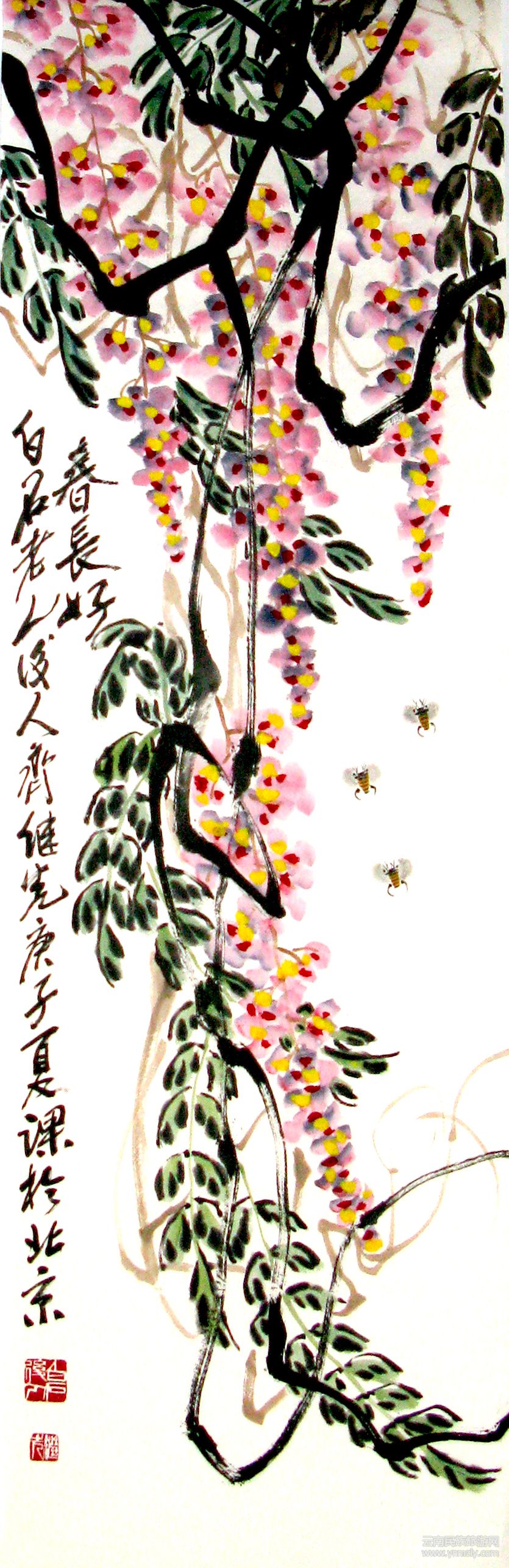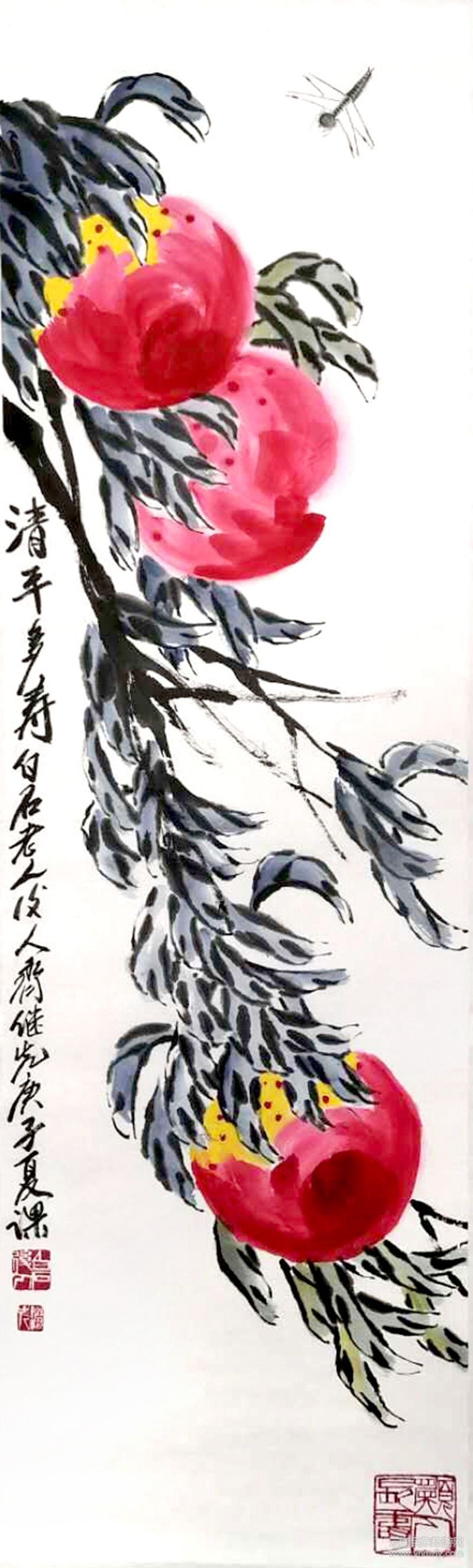 應(yīng)該說(shuō),詩(shī)性,也是天山先生畫(huà)的一大集成。如《萬(wàn)紫千紅總是春》,畫(huà)上一串紫藤瑞氣盈盈、燦若云霞由左上角穿插而過(guò),其間六只可愛(ài)的小蜜蜂在嗡嗡地鬧春。作者題詩(shī)言:“墨走垂藤百尺長(zhǎng),濃陰合處日無(wú)光;筆中自有東風(fēng)在,吹得紫藤紙上香。”文字恬淡自然樸實(shí),“不粘不脫”深化了畫(huà)意。還有他的題畫(huà)桃:“開(kāi)花結(jié)果三千年,瑤池王母侍群仙;揮毫摘得蟠桃在,人人得此是神仙。”題畫(huà)牽牛花:“野根不用栽,只等秋時(shí)來(lái);無(wú)聲喇叭艷,朝朝花自開(kāi)。”題畫(huà)山水:“墨出千層色,筆劈萬(wàn)仞山。”題畫(huà)蟹:“殼硬雙螯好威嚴(yán),八爪橫行奪利貪;它日鉆進(jìn)漁翁簍,方知己肥命將亡。”均給人一種清純、高雅之氣,也顯示出作者的恬淡清凈品格。