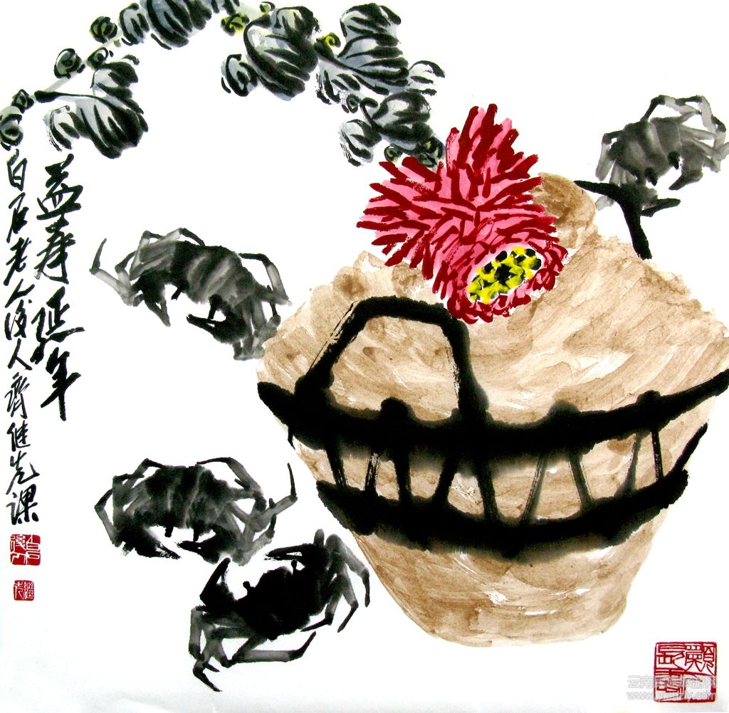 《和諧》圖,作品嚴(yán)謹(jǐn)樸實(shí),講究法度,畫(huà)風(fēng)隨意而多變。畫(huà)中四只螃蟹一上三下、背部圓鼓、腿部有扁有棱有角、有方有圓穿梭在水中,天然成趣,各顯其妙。畫(huà)面讓人產(chǎn)生遐思的是:蠏與蠏的和諧、自由、歡樂(lè)。同時(shí),三角形的構(gòu)圖也很有穩(wěn)定感。