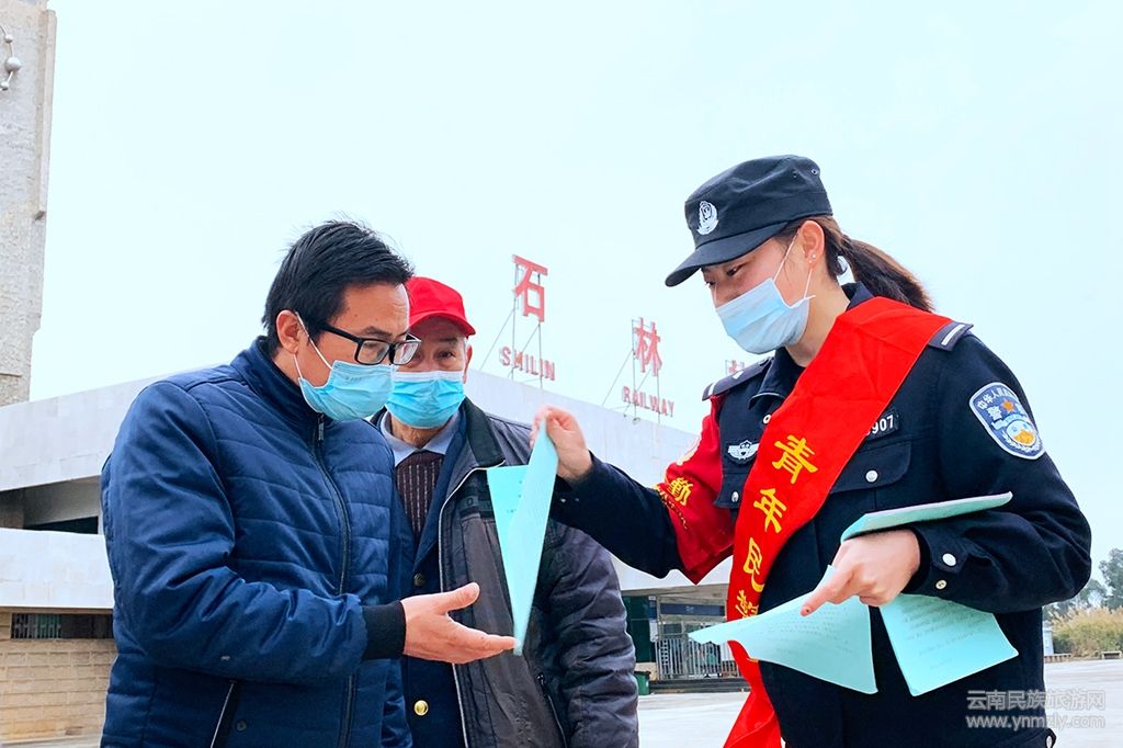 圖為 1月11日,在云南石林火車站站前廣場,民警認真開展法制宣傳