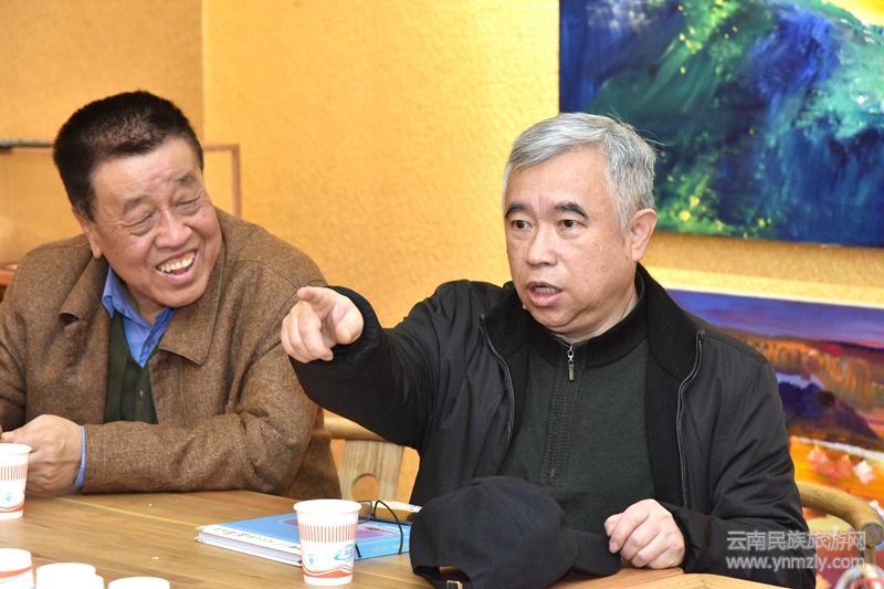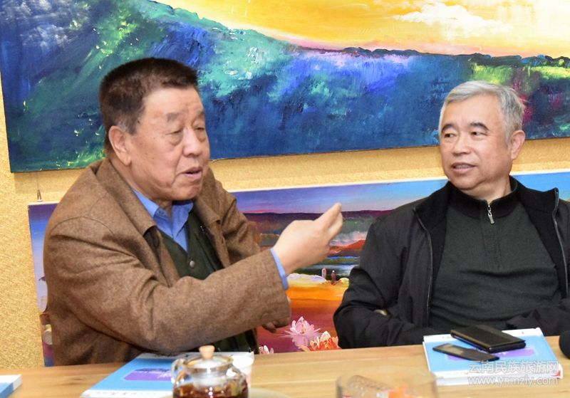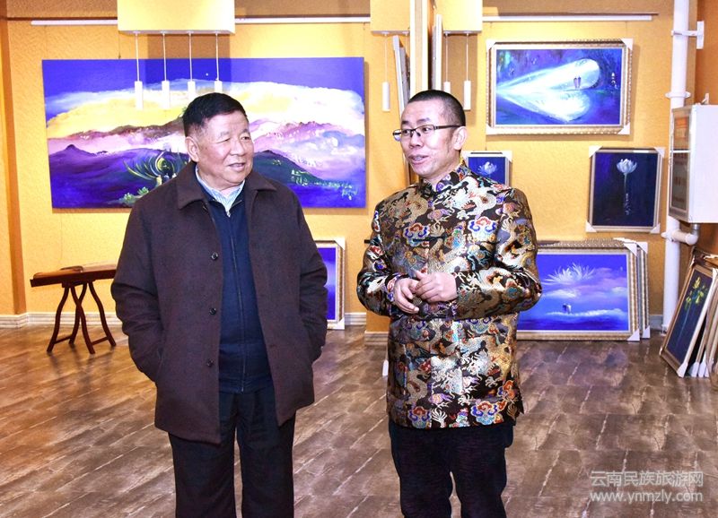 云南省政協(xié)原常務(wù)副主席孟繼堯老領(lǐng)導(dǎo)(左)在丁昌勝美術(shù)館參觀指導(dǎo)