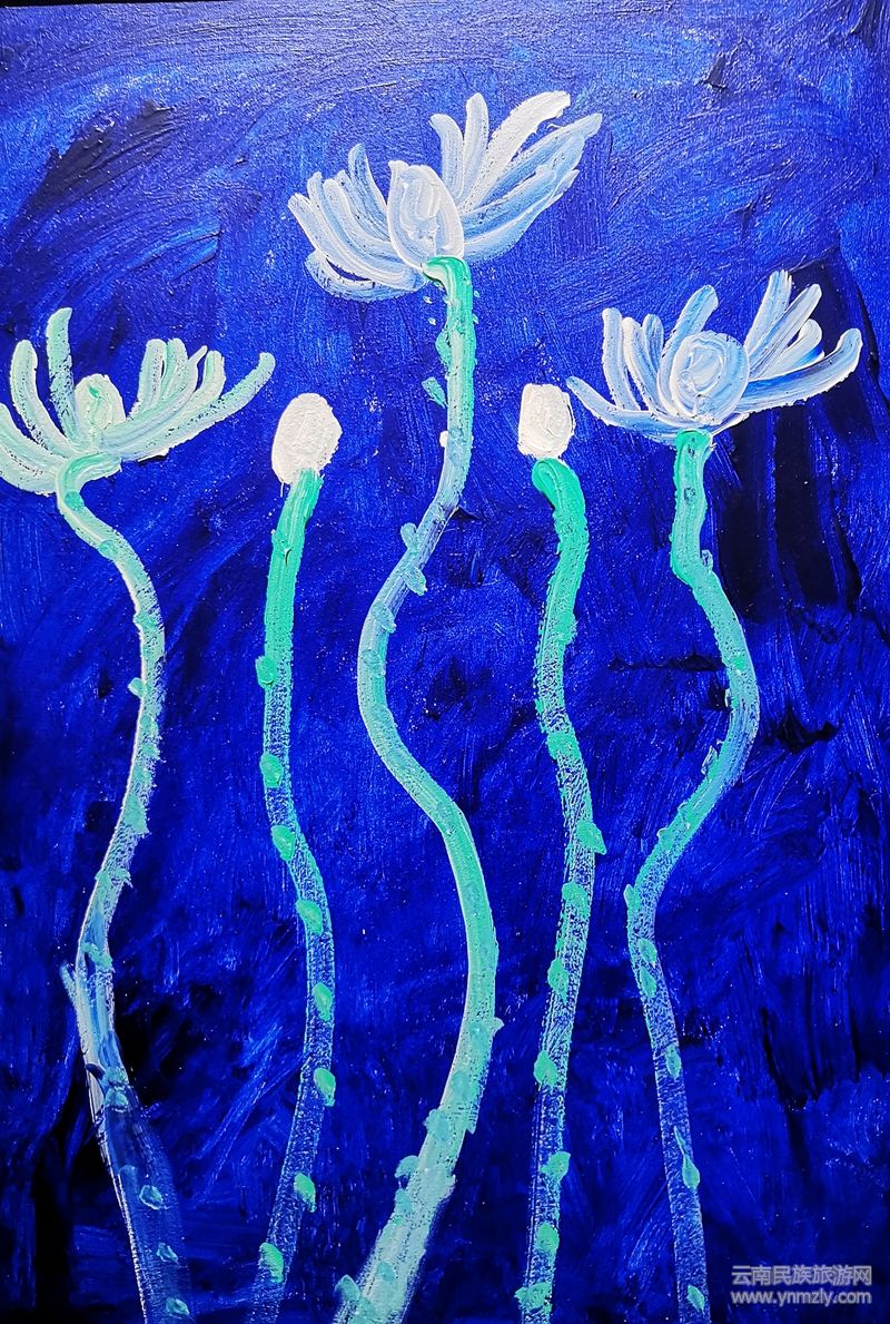 其繪畫以蓮花為主題,大膽運(yùn)用藍(lán)色調(diào),渲染出瑰麗奢華、風(fēng)采迷人的般若世界!他的蓮花被稱為“大寶七彩蓮花”。他用油畫的方式表現(xiàn)出了最美的中國味,把中國紅、中國藍(lán)這兩種最本源的色彩做了最深最美的詮釋,可以說他開創(chuàng)了一種新的風(fēng)格“油畫技法,國畫風(fēng)格”。