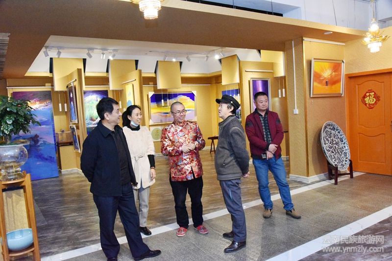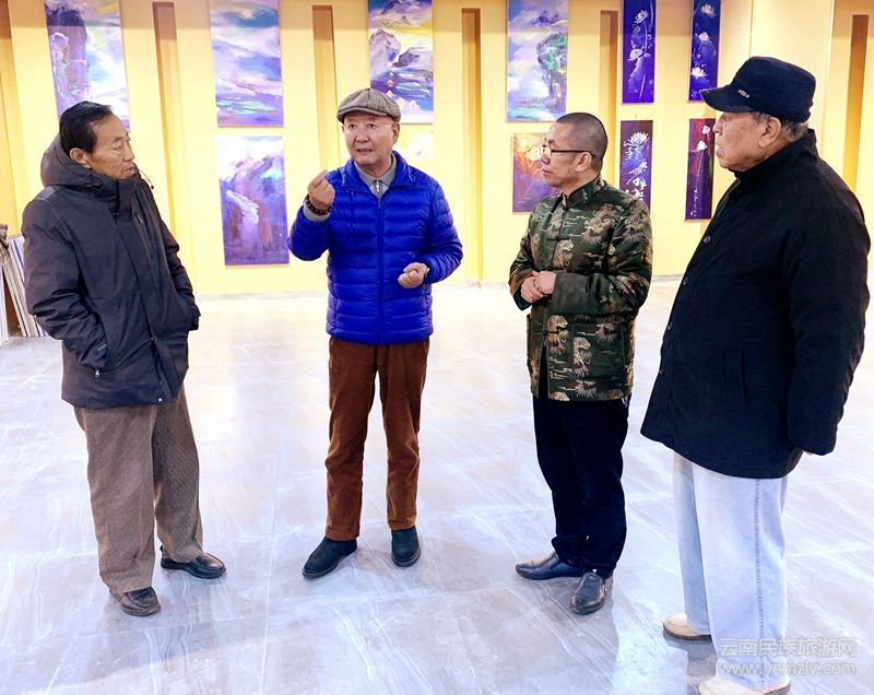 云南省委原副書記、中國文聯(lián)副主席丹增老領(lǐng)導(dǎo)(左二)在丁昌勝美術(shù)館參觀指導(dǎo)