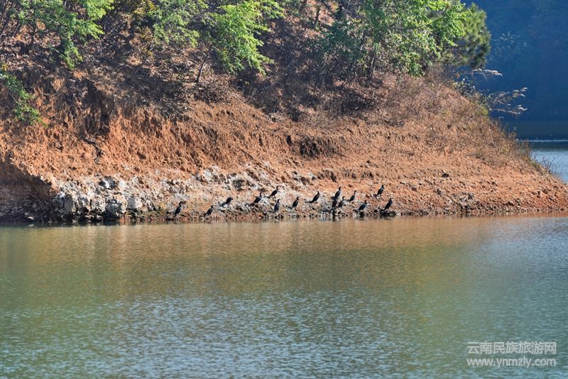 剛到水庫邊,透過長焦鏡頭就能看見,對面岸邊的石頭上蹲著一群黑色的大鳥,但明顯不是野鴨,是什么呢。細細地看,終于認出這是昌寧人稱之為“水老鴰”的鸕鶿,正在那里享受著陽光的溫暖。