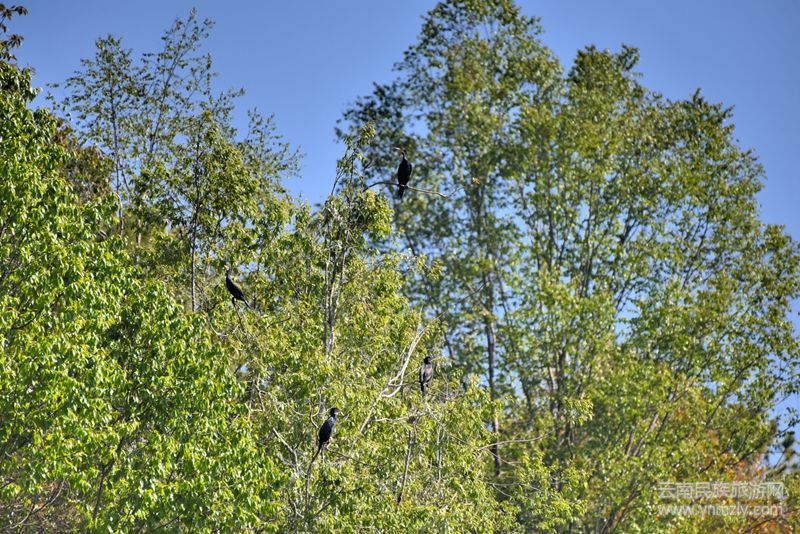 翻過一個小山梁,湖面在一個較狹窄的地方形成了一個水洼,水鳥們又找到了一個安全的地方。“先頭部隊”在水面瀟灑嬉戲,“后續(xù)部隊”則有序準備降落,幾只鸕鶿甚至落在了樹上,靜靜地看著水面上來來往往。