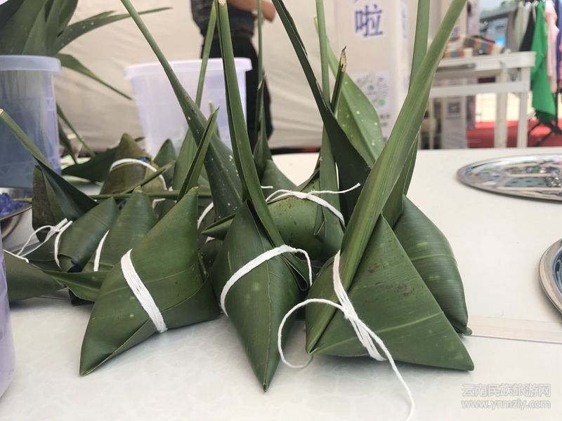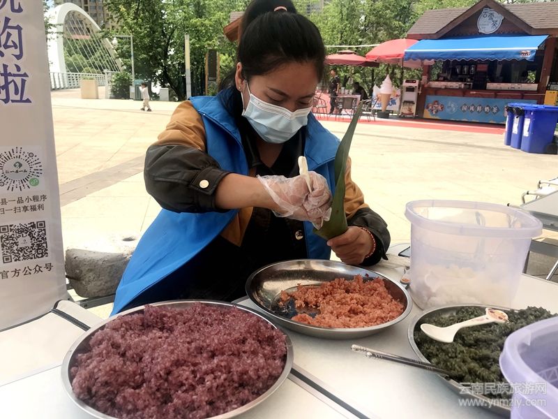 在展區(qū)最顯眼的位置展出的是羅平布依族特色五彩素粽,正值端午佳節(jié)期間,粽子當(dāng)然是必不可少的,這也是此次“一縣一品”展銷會(huì)的主題。在展銷現(xiàn)場(chǎng),銷售人員正在手工制作家鄉(xiāng)的特產(chǎn)——五彩素粽。布依“五彩粽”是布依族五色花米飯進(jìn)行再加工的產(chǎn)品,由天然植物密蒙花、楓香葉、紅高粱、紫蕃藤等精細(xì)熬制成汁,染成黑、紫、黃、紅四種顏色的糯米,再將這四色花米和本色糯米用布依特有粽葉包制成“五彩粽”,是真正的純天然無(wú)公害綠色食品。五彩素粽經(jīng)過(guò)一年多的發(fā)展,已成為布依特色產(chǎn)品,在羅平縣發(fā)展了三個(gè)加工廠,帶動(dòng)100多名當(dāng)?shù)卮迕裨诩议T(mén)口就業(yè)。