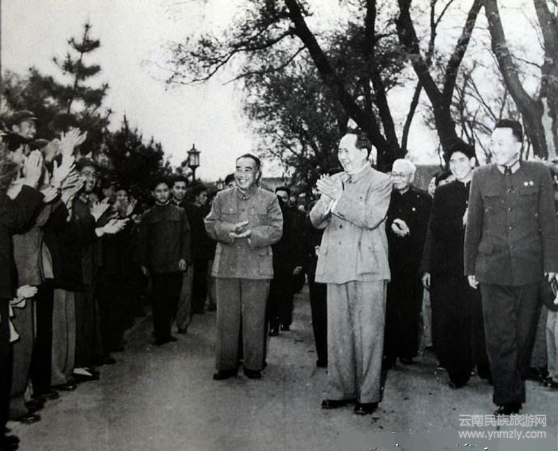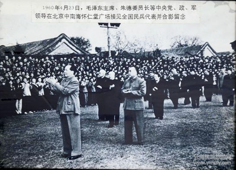 1960年4月30日,毛澤東主席、朱德委員長等中央黨、政、軍領(lǐng)導(dǎo)在北京中南海懷仁堂接見全國民兵代表并合影留念