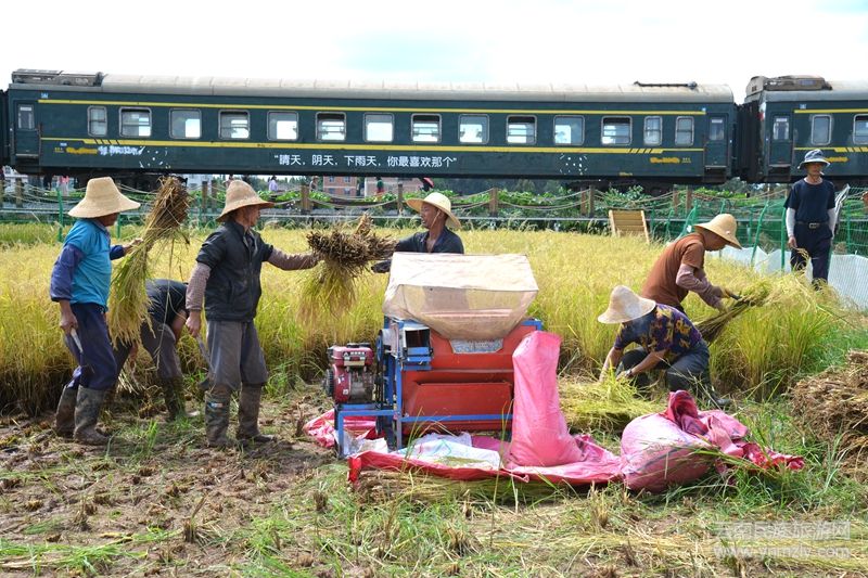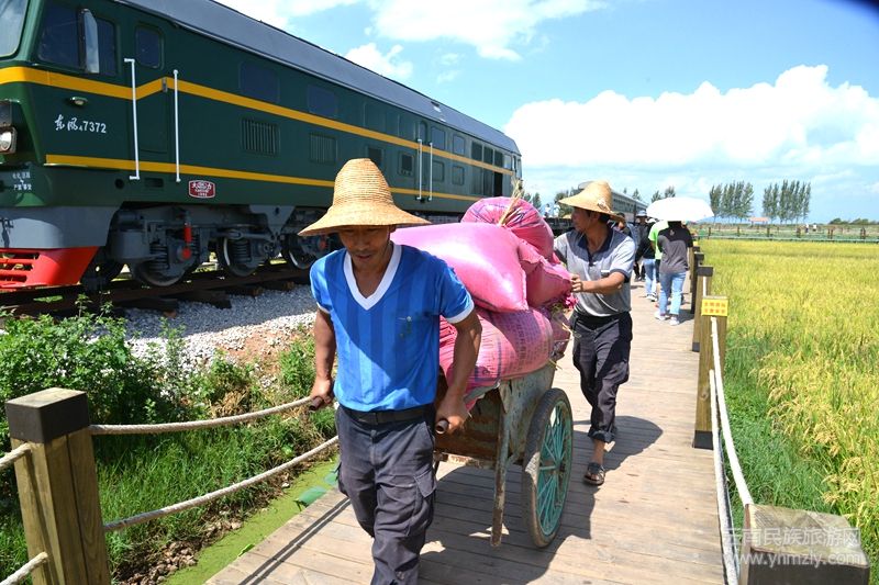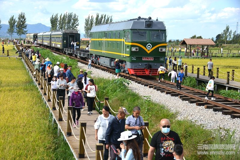 慕名前來的游客們沿著稻田邊的景觀棧道,一路感受田園風光、體驗農耕文化,與穿越稻田的網紅綠皮小火車拍照留影。