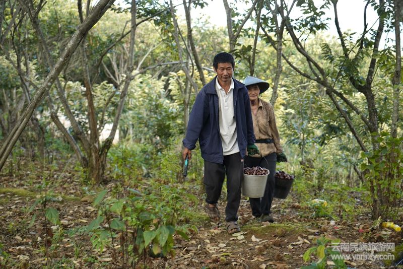 走進(jìn)昌寧縣田園鎮(zhèn)四角田社區(qū),山坡上、公路邊、茶園里、房前屋后,到處都是板栗園,板栗樹隨風(fēng)搖曳,栗果掛滿枝頭。尖山河村民小組村民陳玉武夫妻倆正在自家栗園里采收板栗,陳玉武家種植板栗20多年了,經(jīng)過精心管理,每年都能獲得兩三萬元的板栗收入。