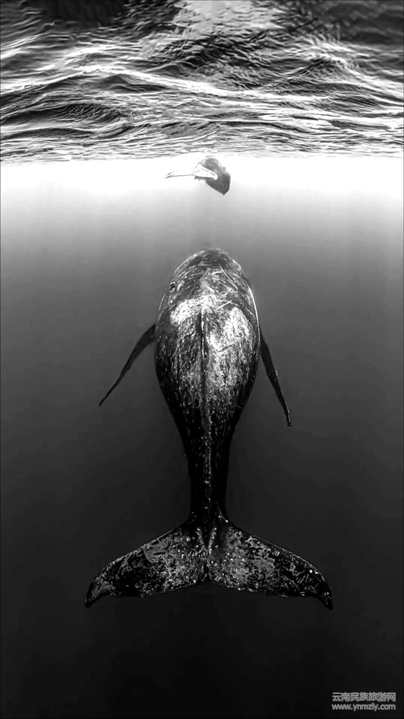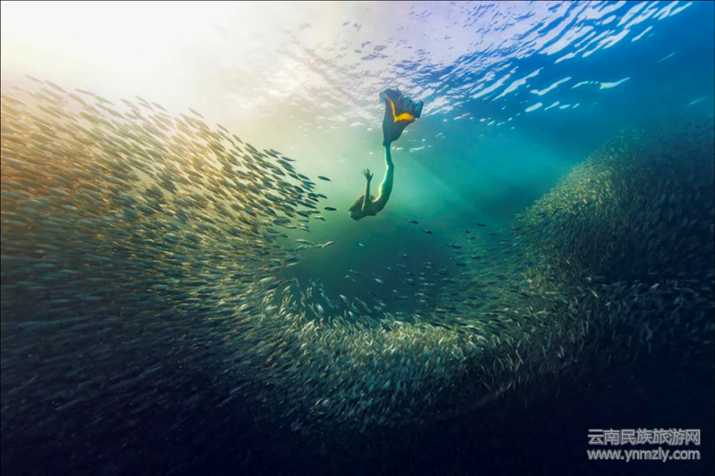 上圖是一幅精心拍攝又極其動(dòng)人的水下攝影,相信有無數(shù)的觀眾為此驚嘆和叫絕。陽(yáng)光投射的水面下,數(shù)以萬(wàn)千的沙丁魚像聽到某種神諭的召喚,簇?fù)矶鴣恚瑖@在美人魚一般的潛水員旁,組成了一幅神奇似乎又不可思議的畫面,猶如一位音樂指揮,奏起了海洋里瑰麗而激蕩的交響樂章;又更像海洋里的一個(gè)童話故事,給人以美的遐想和感染。