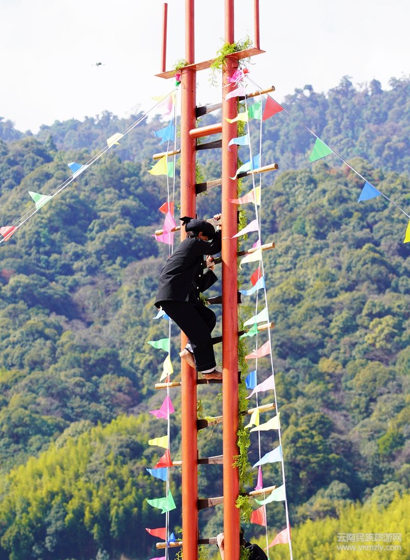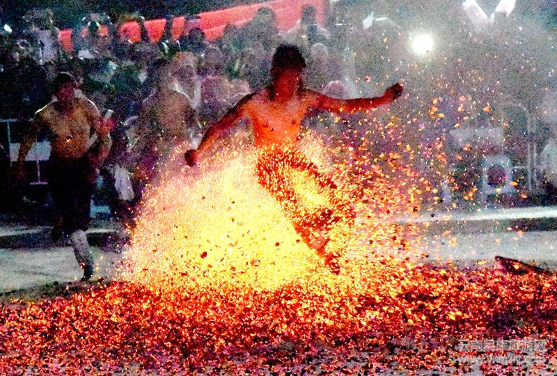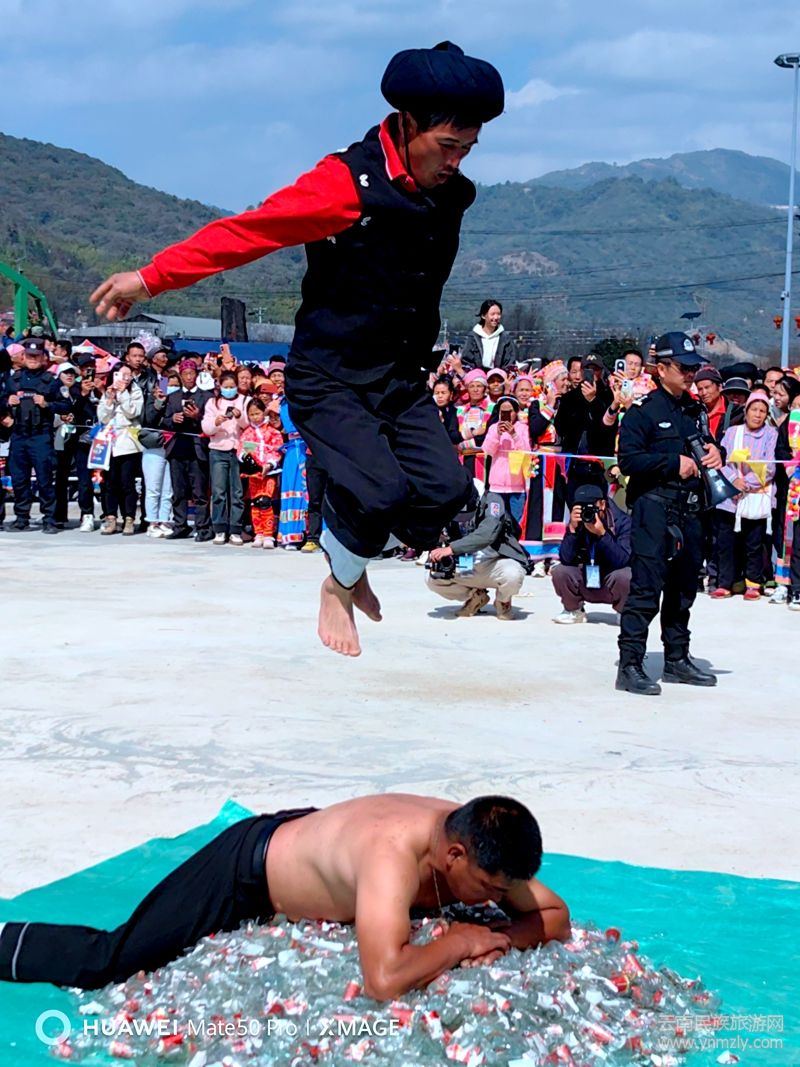 在闊時(shí)節(jié)活動(dòng)中,各種精彩紛呈的民族歌舞表演讓人目不暇接。在濃濃的節(jié)日氣氛下,最令人膽戰(zhàn)心驚的要數(shù)“上刀山、下火海” “踩玻璃”。“上刀山”,傈僳語稱“啊塔的”,主要講述了傈僳族兒女守邊護(hù)邊、保家衛(wèi)國(guó)的故事,它象征著傈僳族兒女誓死保家衛(wèi)國(guó)的精神。“下火海”,即“洗火澡”,意為洗去污濁,象征膽量和勇氣。