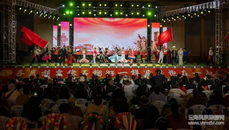 開幕式結(jié)束后,迎賓晚會(huì)在舞蹈《歡騰目瑙》中拉開帷幕,演員們身穿民族服飾,用歌舞演繹各民族團(tuán)結(jié)友愛、共同進(jìn)步的故事,展現(xiàn)了各族群眾積極向上的精神風(fēng)貌和幸福美滿的生活狀態(tài)。