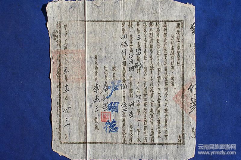 民國35年12月騰沖職業(yè)學校校長尹明德發(fā)給的水碾牌照 (賈志偉收藏)
