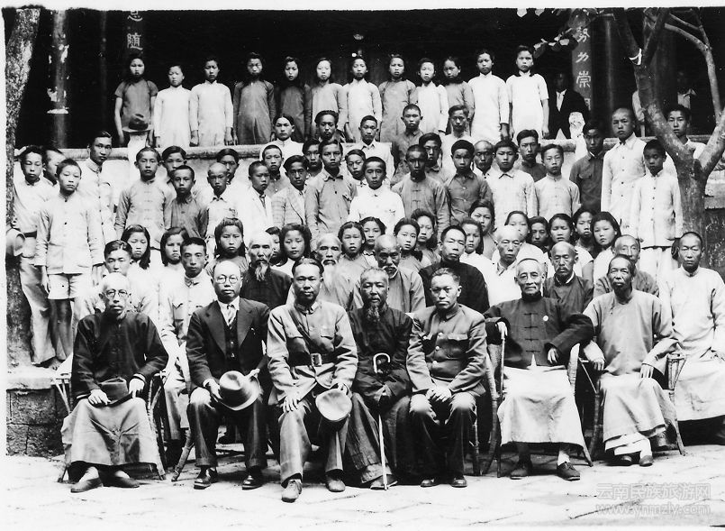 尹明德1948年騰沖益群中學復校時的合影。前排自左至右為李鴻美、尹明德、楊茂實、李根源、李國清、劉楚湘、李啟慈。后排有張德輝、“永茂和”三兄弟李德和(字致卿)、李德爵(字朝卿)、李德賢(字任卿)等 (賈志偉提供)