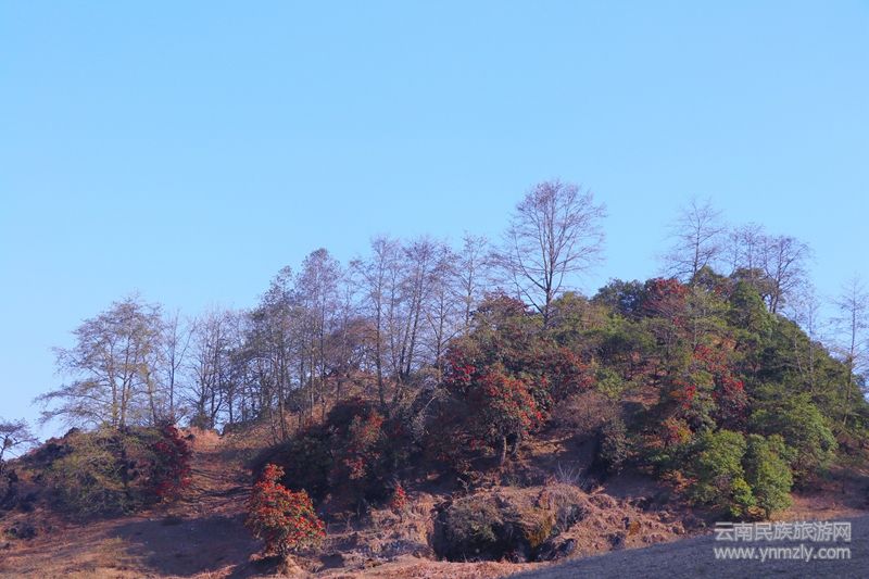 八彎埡口這個東高西低的圓形山包,當?shù)赜址Q冒坡地,海拔2204.8米,經(jīng)度98.44,緯度25.61。在這個基本由石塊、石筍堆積而成的山包上,石筍、石巖嶙峋,低矮灌木叢,挺拔榿木樹與二、三十棵馬纓杜鵑花相伴共生,而大片古杜鵑,漫山遍野,格外火紅耀眼。