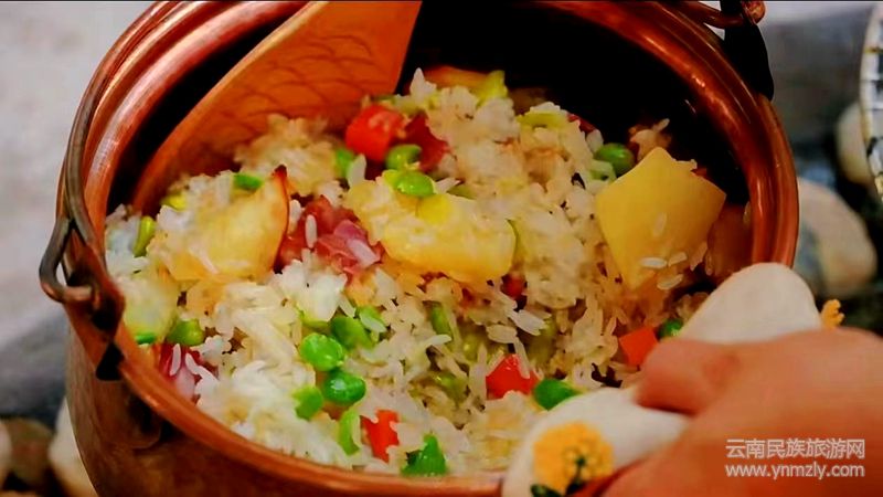 將牛干巴或臘肉與洋芋煸炒熟后倒入熟米飯,在鋪上一層蠶豆米,撒入少許鹽水或醬油,蓋上鍋蓋,靜待美味的“醞釀”。