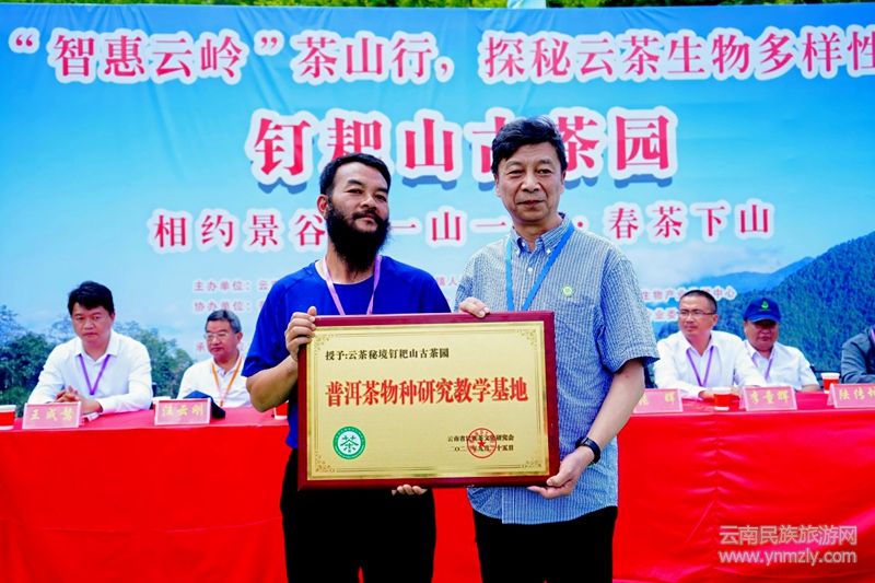 云南省民族茶文化研究會(huì)執(zhí)行會(huì)長(zhǎng)陳正榮授予云茶秘境釘耙山古茶園“普洱茶物種研究教學(xué)基地”的匾牌,陳正榮說(shuō):“景谷是一個(gè)神奇的地方,釘耙山更是一個(gè)秘境,這里茶葉資源豐富,有細(xì)葉茶、喬木大葉種、小葉種、紅梗紅葉等等。研究會(huì)將釘耙山定為普洱茶物種研究教學(xué)基地后,期待更多的專(zhuān)家和茶友到這里探秘。”