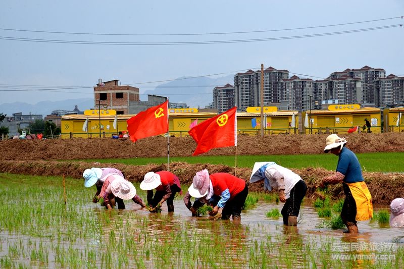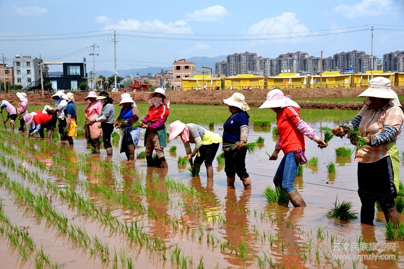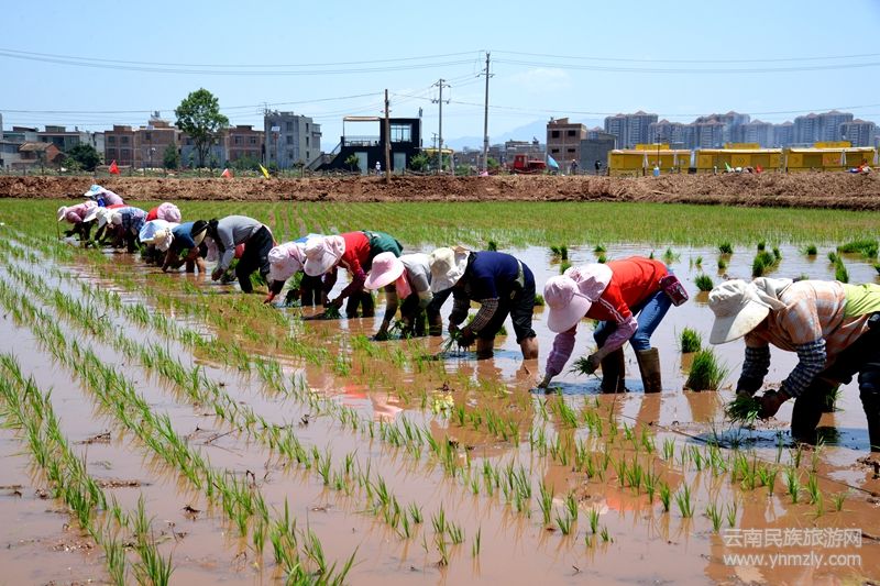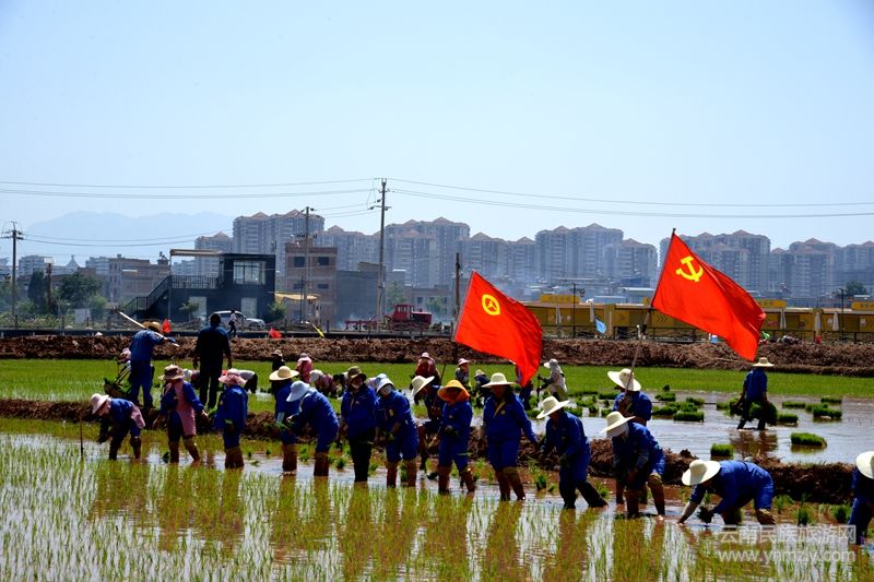 田中正在飛快地插秧的、除當(dāng)?shù)厝罕娡猓€有企業(yè)來支援春耕生產(chǎn)一線為人民服務(wù)的浩坤磷化集團(tuán)的50名團(tuán)員。