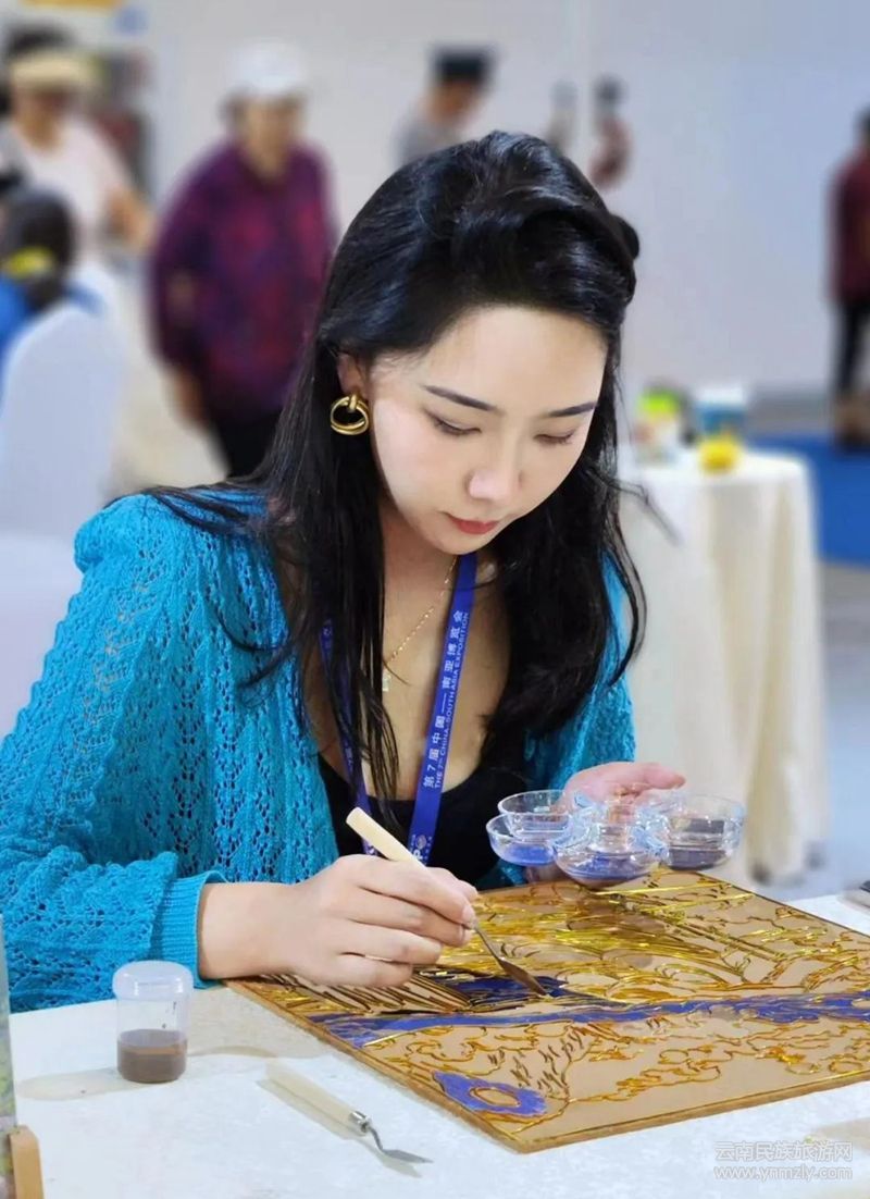 她還通過參加南博會(huì)、旅交會(huì)、文博會(huì)、非遺集市等機(jī)會(huì)讓更多的人了解掐絲琺瑯這一技藝。在2023年8月中旬的南博會(huì)上,她的作品《過溜索的小女孩》深受青睞,最終被一位上海的收藏家以較高價(jià)格收藏。