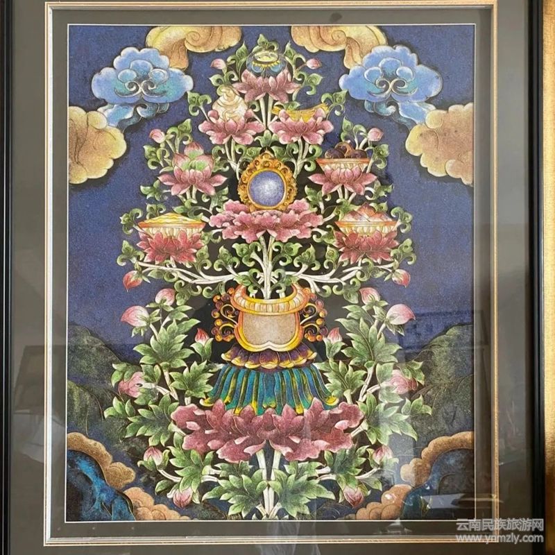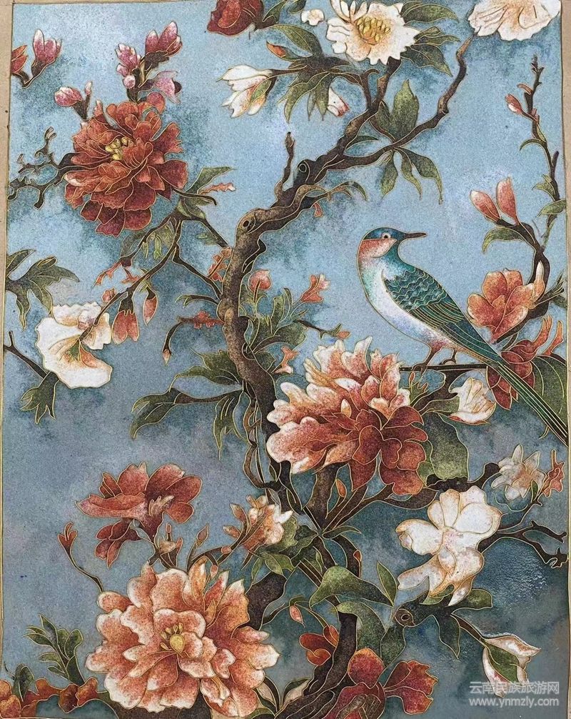 有資料介紹,掐絲琺瑯彩畫技藝起源于元朝 1253年,即忽必烈和麗江阿良聯(lián)合攻打大理國(guó)(普米族人充當(dāng)了先頭部隊(duì))時(shí),留下了部分琺瑯工匠及銀胎琺瑯器皿,并運(yùn)用了景泰藍(lán)的鑲聯(lián)工藝,用金屬銅絲、銀絲和彩沙石、礦粉為主要原料,精心制作出各種風(fēng)格、圖案、顏色、規(guī)格的裝飾畫。