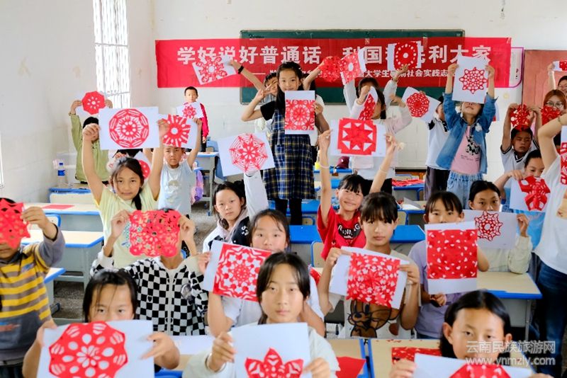 多彩支教助力成長。志愿者們?yōu)樾碌切W(xué)的白族娃娃開展豐富多彩的支教活動。他們在手工課上,為白族娃娃們上了一堂別開生面的剪紙課,教孩子們剪出象征民族團(tuán)結(jié)的花朵。在跆拳道課堂上,志愿者示范馬步、沖拳、腿法、格擋等基礎(chǔ)動作,將孩子們分成三組,采用折返接力比賽的方式,增強(qiáng)孩子們的訓(xùn)練效果。在音樂課上,他們教孩子們歌唱《歌唱祖國》,激昂的旋律和熱烈的歌詞回蕩在教室中,孩子們在歌聲中感受到祖國的偉大和美麗,用歌聲傳遞了愛國情感,更在心靈深處厚植愛國之情。在書法課上,志愿者們教孩子們認(rèn)識不同的筆畫和筆順,通過反復(fù)練習(xí)基本的筆畫讓孩子們熟悉毛筆的運(yùn)用和控制,他們逐漸學(xué)會用毛筆寫下自己的名字、寫下“我愛中國”、寫下“為中華之崛起而讀書”,在書寫中感受到中國傳統(tǒng)文化的魅力,增加了對書法和祖國的熱愛。