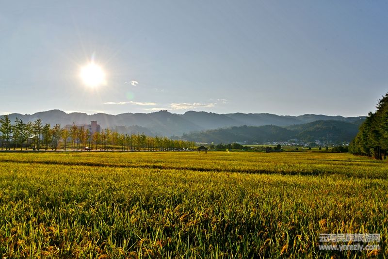 當(dāng)?shù)咎餄u漸披上了“黃金甲”,田園里洋溢著豐收的氣息,太陽也不知不覺醉于其間,緩緩從西邊落下后,余光依然流連于天空,點(diǎn)燃了云朵,直到天幕完全落下,依然用若隱若現(xiàn)的姿態(tài),與漸漸亮起的燈光遙相呼應(yīng)。