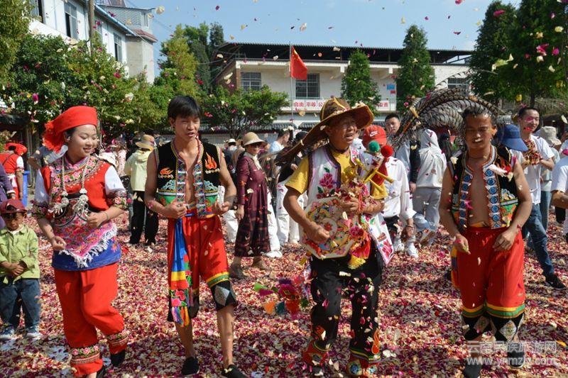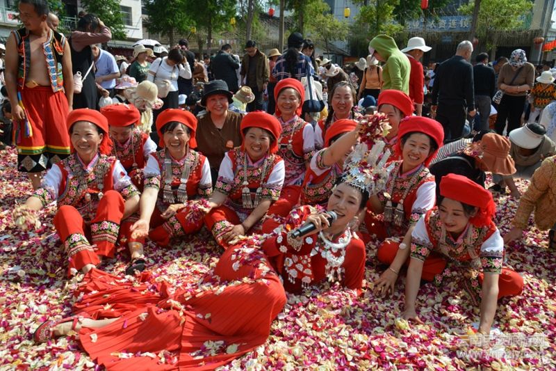 民間民俗巡演結(jié)束后,“鮮花尋寶”活動(dòng)早已就緒。在活動(dòng)場(chǎng)地正中,用玫瑰花瓣鋪成的“古城米線節(jié)” 字樣十分醒目。最有意思的是,這些花瓣之中都藏有兌換寶物的卡片。活動(dòng)主持人一聲令下,村民和游客們紛紛沖進(jìn)玫瑰花瓣的海洋,大家一邊翻找卡片,一邊向周圍的人撒去象征祝福的花瓣,將歡樂(lè)的氣氛推向高潮……