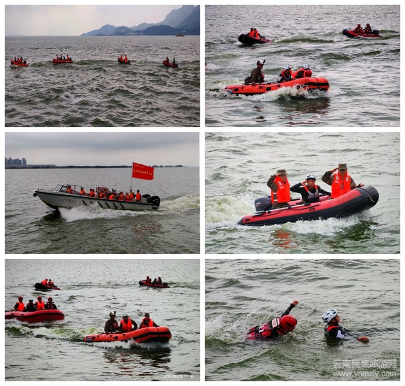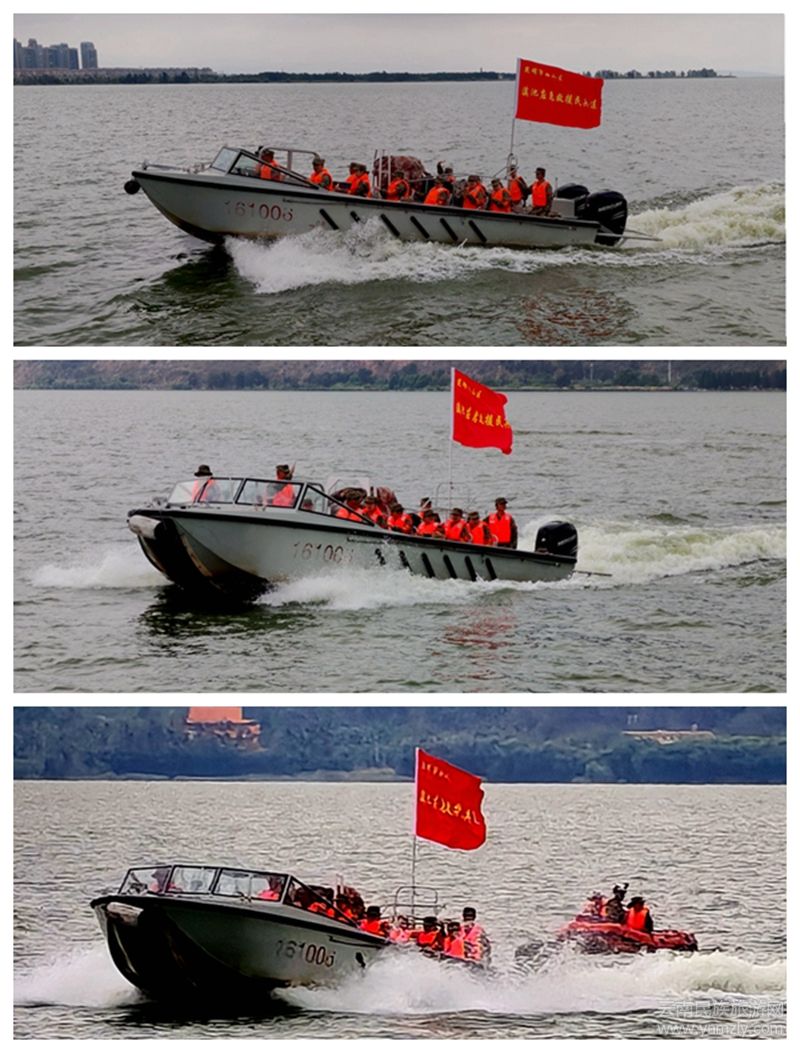 隨后,參加活動的軍地領(lǐng)導(dǎo)及民兵代表們機動至昆明市公安水警碼頭,登船觀看該民兵連在滇池水域展開的應(yīng)急救援相關(guān)課目演示:由7艘沖鋒舟和5條皮劃艇組成的演練隊伍,在40多名民兵的熟練操控下,首先成一路縱隊跟隨指揮船在滇池水面上破浪開進。隨后,隊伍成“S”形快速前進約200米后,迅速變換隊形,成兩路縱隊前進約300米,在距指揮船約100米時,全體船員(除船長外)面向在指揮船觀看演示的軍地領(lǐng)導(dǎo)敬禮問好。爾后,演練隊伍到達(dá)指揮船尾,并從指揮船尾繞行,隊伍成“人”字形向指揮船頭以遠(yuǎn)方向全速開進約300米后,再次成一路縱隊回到集結(jié)點待命。同時,皮劃艇同步進行水上搜救演練。